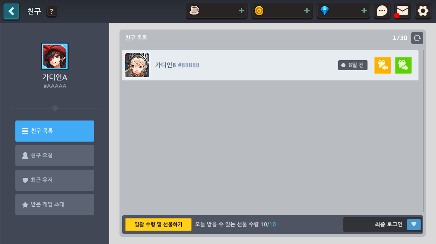 - 등록된 모든 친구에게 매일 한 번씩 선물을 전송할 수 있습니다.