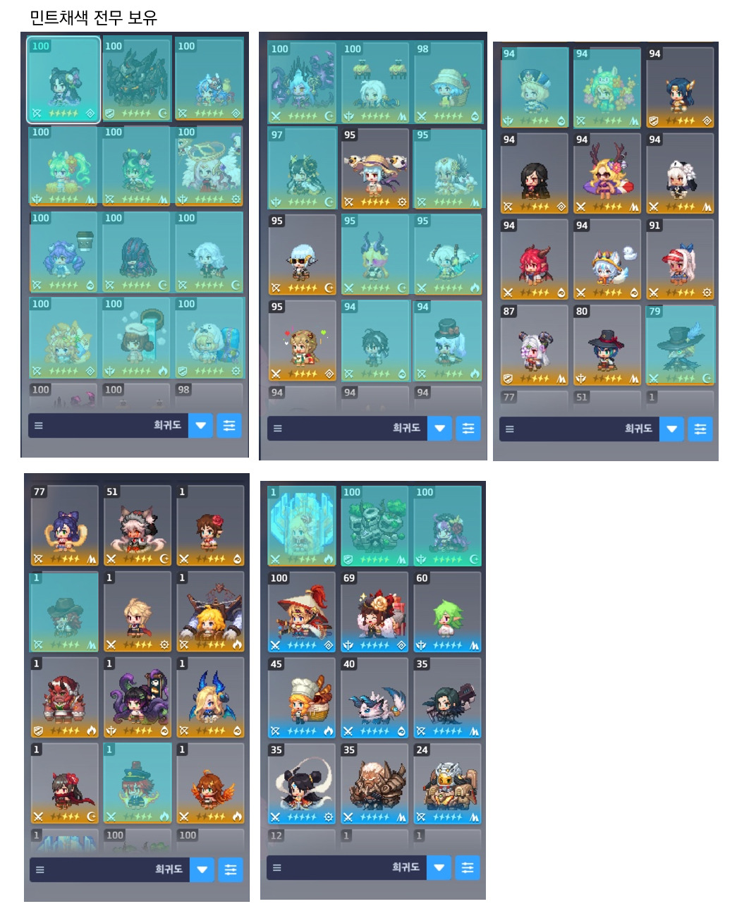 현재 보유 캐릭터들입니다. 오그마는 칼/총 둘 다 있습니다.