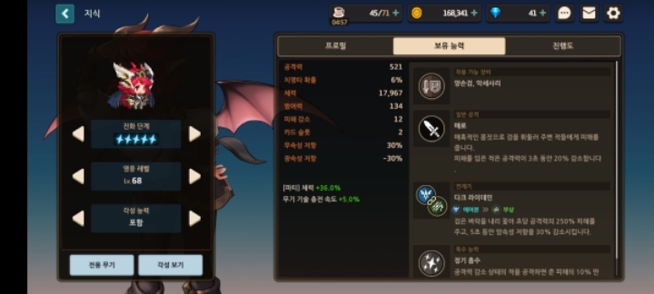 각성 효과는 팀의 체력 증가와 자신의 무기 기술 충전 속도 증가.