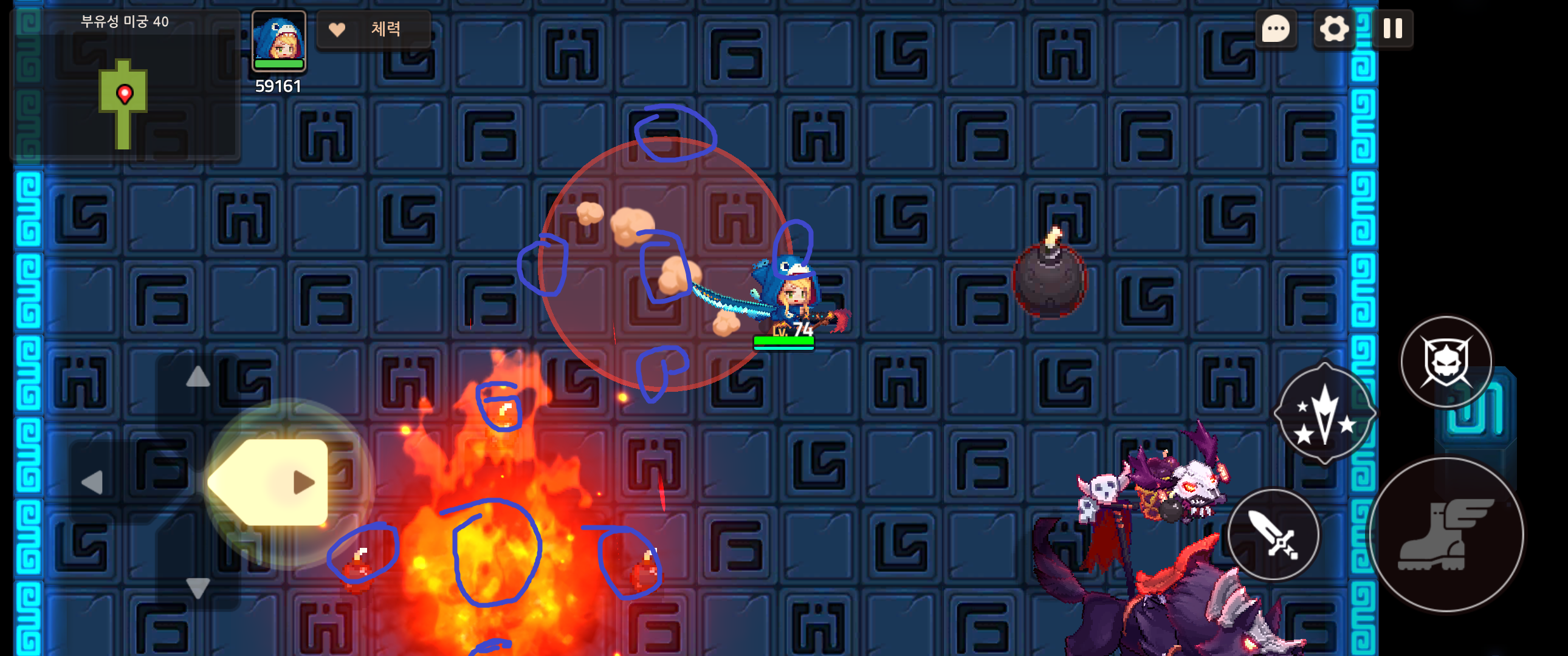 손톱 휘두르는걸 피했다면 다음 패턴은 돌진입니다. 고블린 족장은 돌진하고 돌진한 자리에다 폭탄을 떨어뜨리고 갑니다.