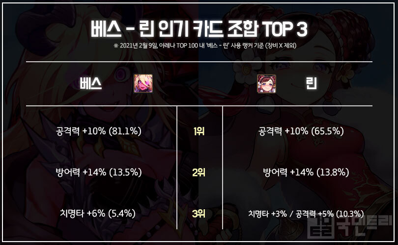 카드 조합은 두 영웅 모두 ‘공격력 +10%’가 대세였다. 특히, ‘베스’는 ‘공격력 +5%’ 페어 픽률이 무려 81.1%로, 다른 카드는 거의 선택하지 않는 분위기다. 그나마 ‘린’은 ‘공격력 +10%’가 65.5%로 조금 낮았고, ‘치명타 +3%’와 ‘공격력 +5%’, ‘방어력 +7%’를 섞어 쓰는 경우가 종종 나타났다.