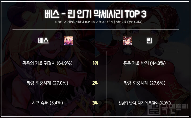 인기 악세사리와 카드는 대체로 비슷했다. 먼저 ‘베스’는 ‘귀족의 거울 귀걸이 – 공격력 +10%’가 대세였다. 그리고 ‘린’은 ‘홍옥 거울 반지 – 공격력 +10%’였는데, 둘 다 ‘거울 악세서리 + 공격력 +10%’로 구성이 같다.