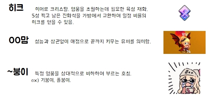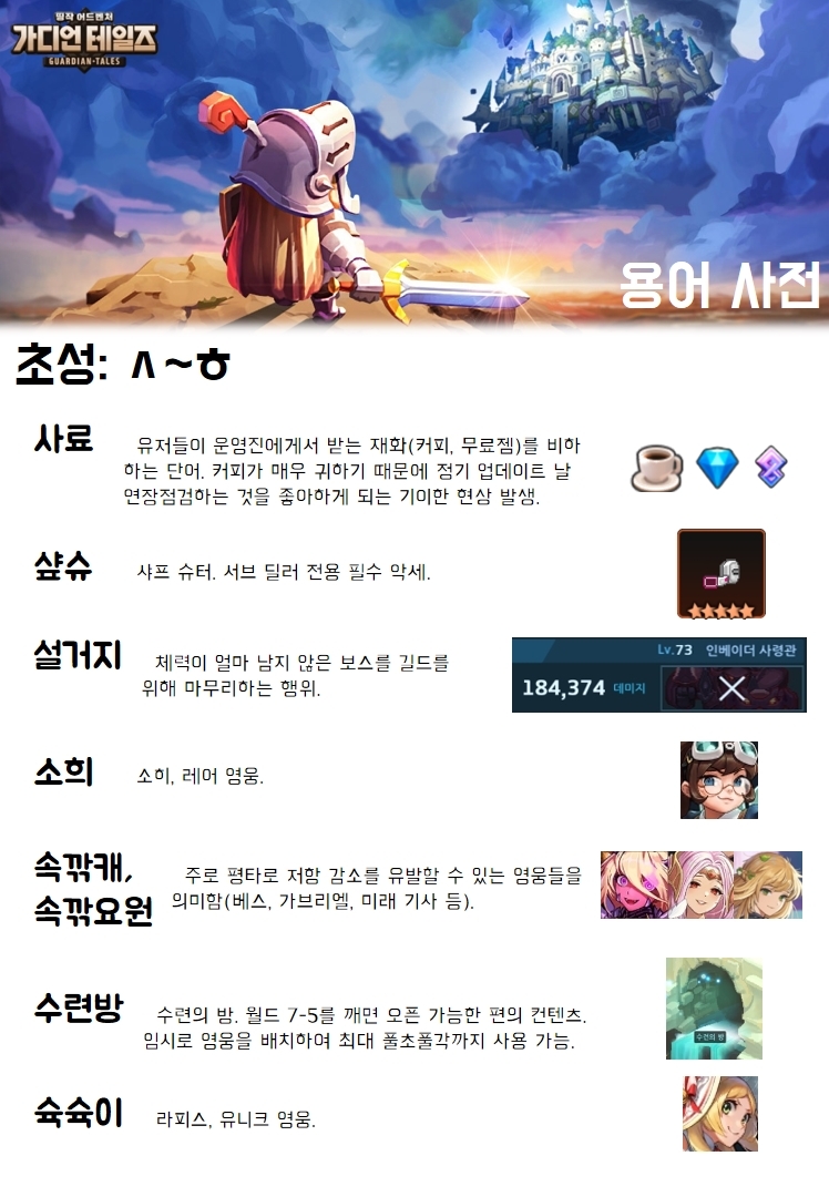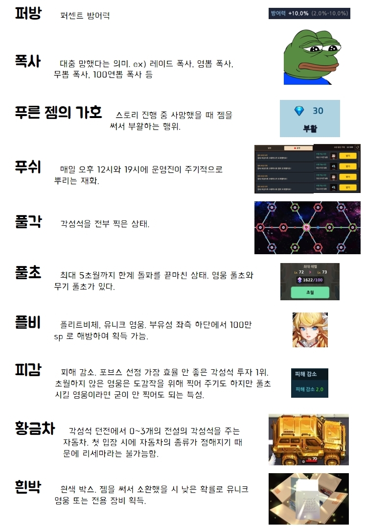 [뉴비 용어 사전] 초성 ㅅ~ㅎ 편 작성자필이|작성시간21.02.16|조회수1,733 목록 댓글 10 글자크기 작게가 글자크기 크게가 [뉴비 용어 사전] 1 편 바로가기↓↓↓↓↓↓↓↓↓↓↓↓↓↓↓ 다음검색 현재 게시글 추가 기능 열기 북마크 공유하기 신고 센터로 신고 댓글 댓글 10 댓글쓰기 답글쓰기 댓글 리스트 답댓글 작성자필이 작성자 본인 여부 작성자 | 작성시간 21.02.16 뉴비는 그런거 몰라도 됩니다 ㅎㅎ.. 작성자손잡이 전문 드림테라피스트 아테세 | 작성시간 21.02.16 유니크 영웅 티니아라뇨... 틀렸잖아요 티나아죠 답댓글 작성자필이 작성자 본인 여부 작성자 | 작성시간 21.02.16 ㅋㅋㅋㅋㅋㅋㅋㅋㅋㅋㅋㅋ 작성자앜당 | 작성시간 21.02.16 성능도좋단말이야ㅠ 답댓글 작성자타이레놀 | 작성시간 21.02.18 이미지 확대 댓글 전체보기
