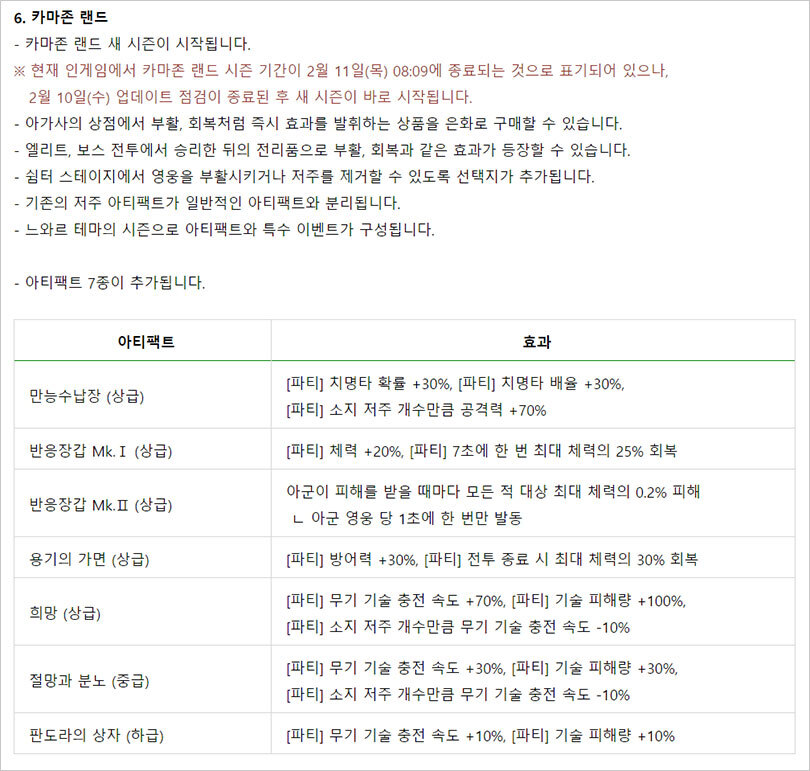 이런 카마존 랜드가 지난 2월 10일 새 시즌을 시작했다. 신규 아티팩트가 등장했으며, 기존 아티팩트는 제외되어 메타에 변화가 생겼다. 그럼 새 시즌을 연 카마존 랜드의 인기 아티팩트는 무엇일까? 정보를 얻기 위해 국민트리가 TOP 50 랭커들의 아티팩트를 정리했다. 관련 내용을 본문에서 확인해보자.