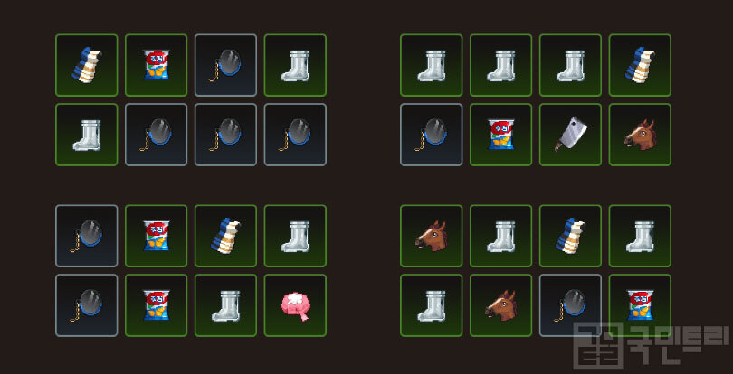 상술한 구성은 모두 20층 이상 공략에 성공한 TOP 50 랭커들의 결과물이다. 초반부터 이 모두를 만족하는 건 당연히 어렵고, 최종 구성의 한 예로 참고하면 된다. 완성 전에는 단독으로도 효율이 좋은 ‘귀티 나는 망토’, ‘노움들의 판옵티콘’, ‘스피드건’, ‘자라나는 타블렛’, ‘대련용 안드로이드 19호’ 등으로 빌드업하는 게 일반적이니 참고하자.