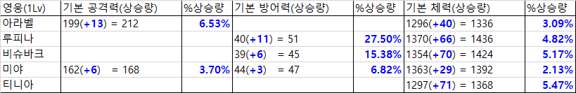 패치노트에 나온 스탯 상향표는 1레벨 기준에 절대적 수치만이 나와있어 한눈에 파악하기 힘들어서 작성