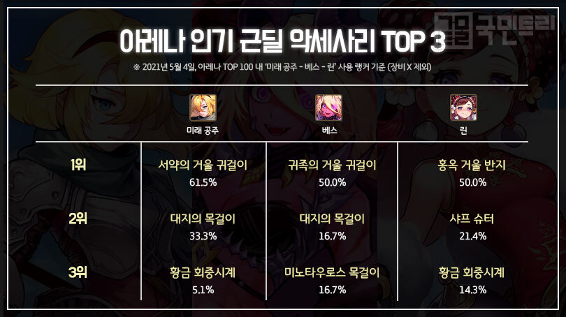 세 영웅의 인기 악세사리는 이변이 없었다. ‘거울 악세사리’가 모두 1위를 차지했고, 픽률 역시 과반수였다. 이 가운데 ‘미래 공주’는 61.5%로 지분이 가장 높았는데, 공격과 방어 모두 신경 쓰는 분위기가 반영된 결과로 풀이된다.