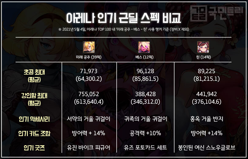 ‘가디언 테일즈’의 아레나는 근접 영웅들이 강세다. 과거 ‘베스’ 등장 후 도래한 메타이며, 최근 ‘Mk.99’와 ‘메이릴’ 업데이트로 약간 주춤하지만 여전히 아레나의 주요 포지션으로 꼽힌다. 이런 근딜 캐릭터 중 특히 돋보이는 건 ‘미래 공주’와 ‘베스’, ‘린’이다. 셋 다 아레나 고티어를 자랑하고, 그 주의 맵과 큰 상관없이 활약한다. 이에 국민트리가 아레나 랭커들은 이들을 어떻게 활용하고 있는지 세팅과 스펙 정보를 정리했다.