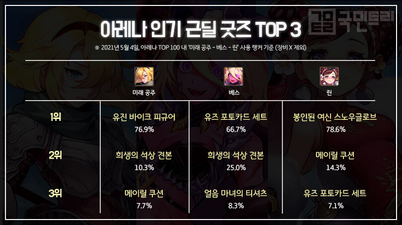 굿즈는 각 영웅의 속성과 맞는 태생 2성 장비가 1위를 석권했다. ‘미래 공주’는 ‘유진 바이크 피규어’, ‘베스’와 ‘린’은 각각 ‘유즈 포토카드 세트 – 봉인된 여신 스노우글로브’로, 이름은 다르나 모두 체력과 방어력, 속성 공격력이 증가한다.