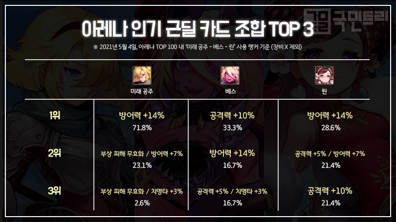 카드 조합은 방어력 +14% 조합이 대세였다. ‘미래 공주’와 ‘린’은 해당 부문 1위, ‘베스’는 2위를 차지했다. 특히, 탱커인 ‘미래 공주’는 픽률이 71.8%나 될 정도로 큰 인기를 누렸다. 더불어 ‘린’은 기본 방어력이 높다는 게 영향을 미친 모습이다.