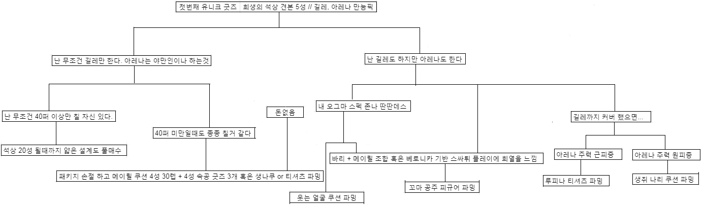 2. 이후 본인 성향에 따라 길레는 석상, 모선위주 파밍 / 아레나는 2픽 굿즈로 기피o 꼬공피, 기피x 웃는얼굴 파밍 권장