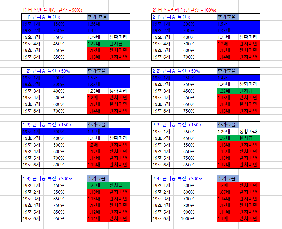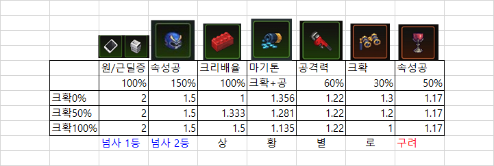 상황별(파티버프, 특전 고려) 근/원딜증 아티팩트 공증효율