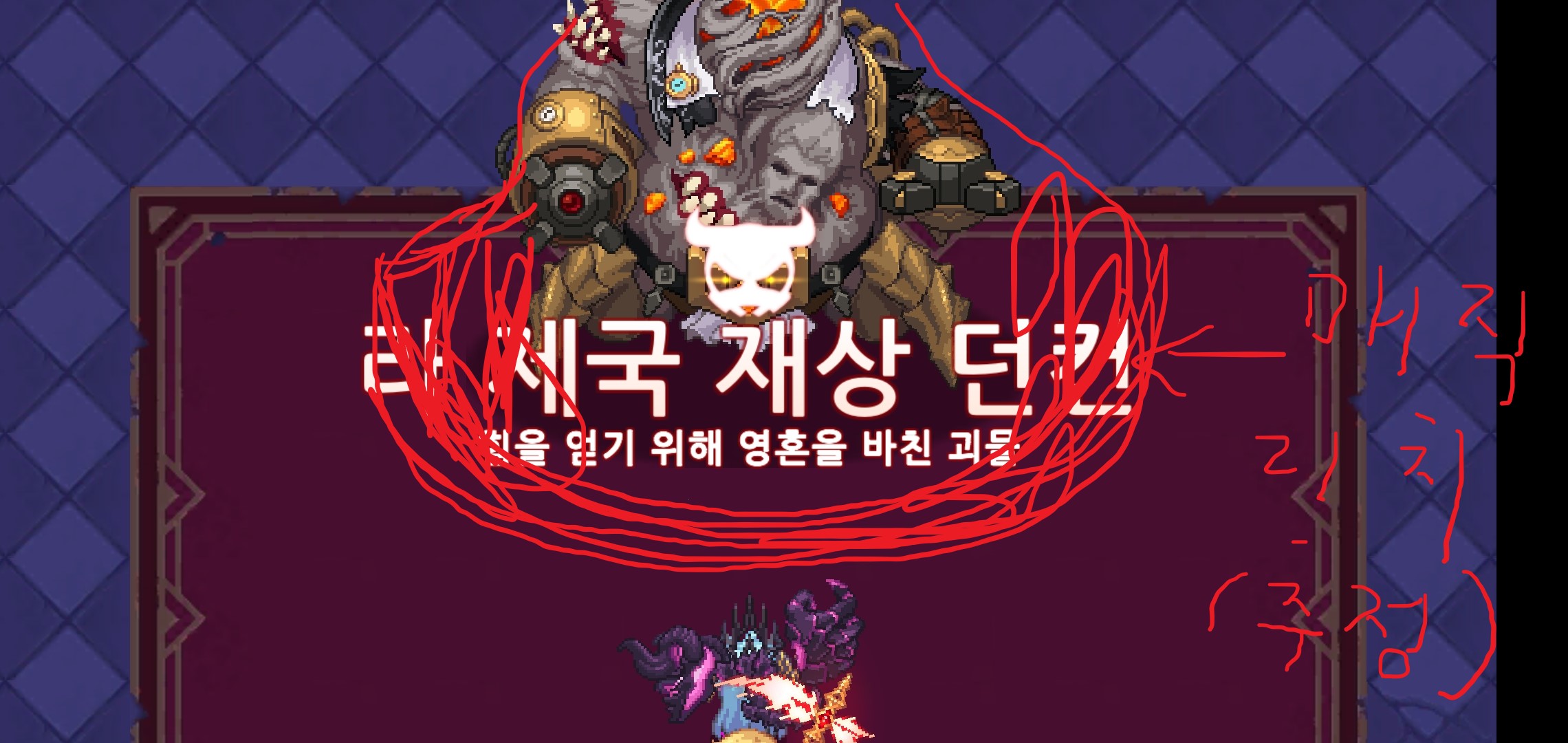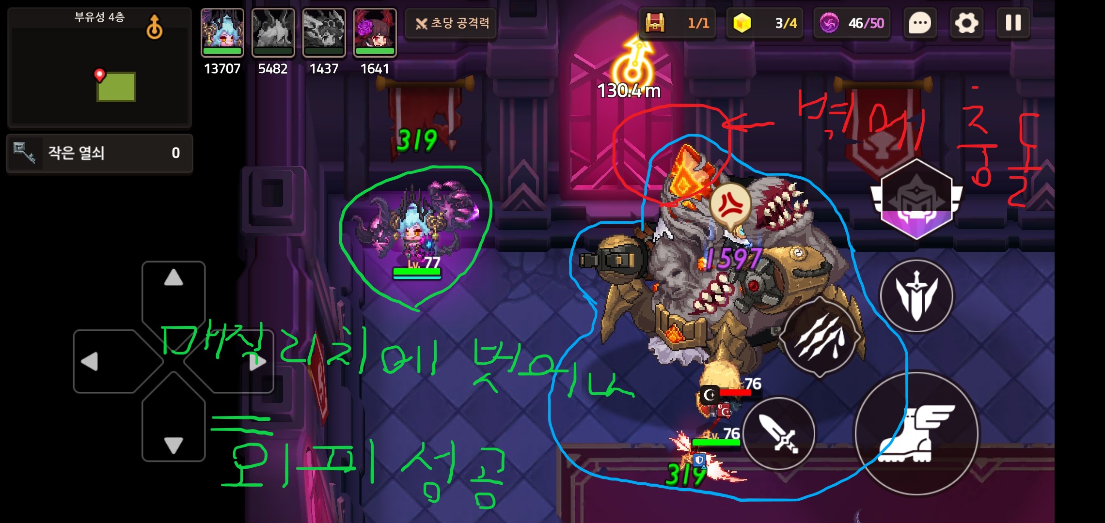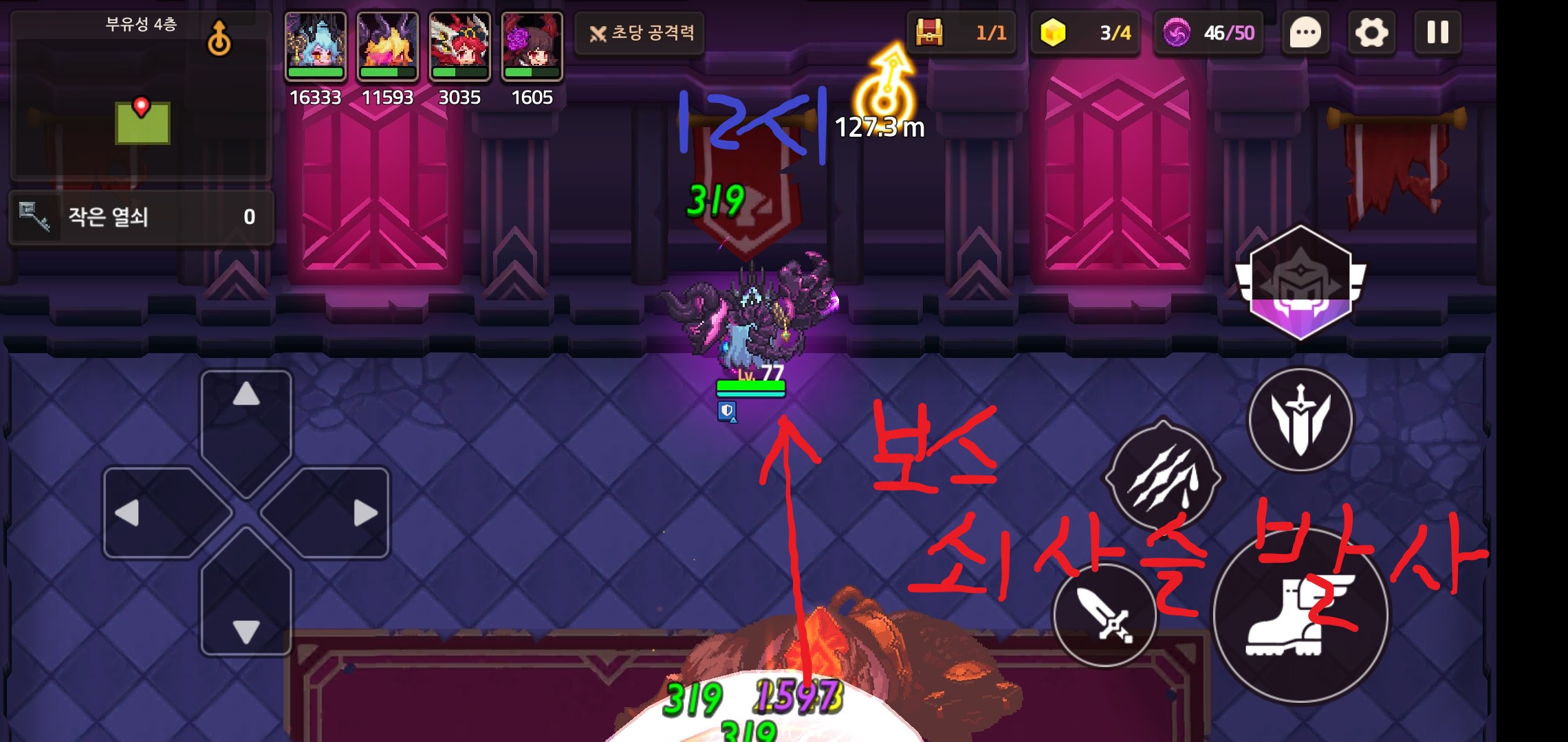 거리를 남기고 대기를 해줍니다. 모서리쪽에 너무 가까우면 매직리치가 없어도 정작 보스의 몸통으로 인해