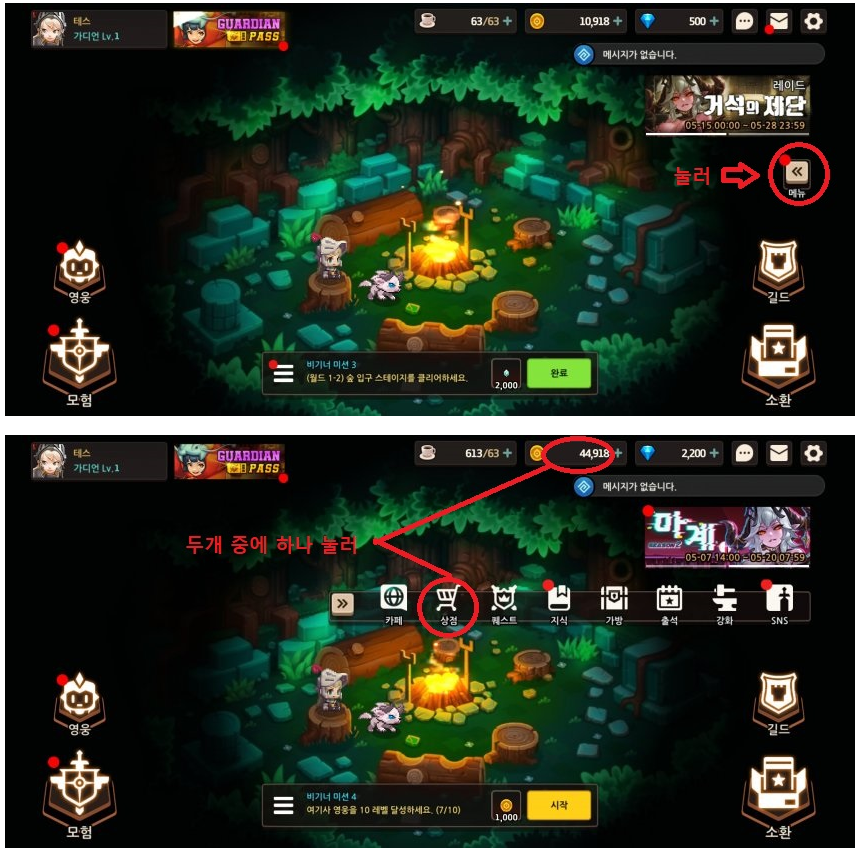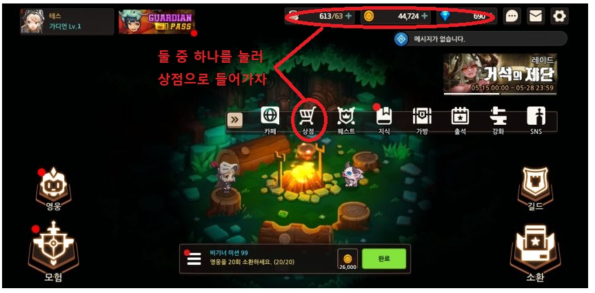-메뉴 - > 상점을 누르거나 상단에 골드 그림있는 곳을 눌러보자