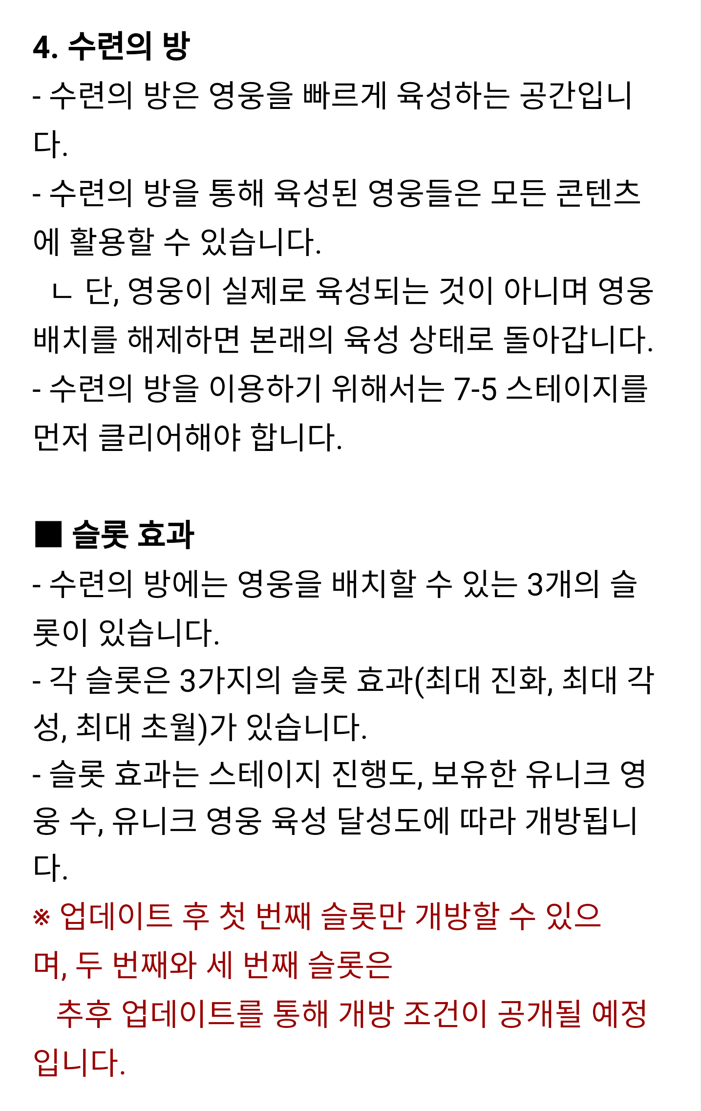 그러나, 이 기능들은 해당 캐릭터가 수련의 방에 있을때만 적용되고, 수련의 방을 이용하지 않으면 수련의 방에 넣기전의 상태로 되돌아갑니다.