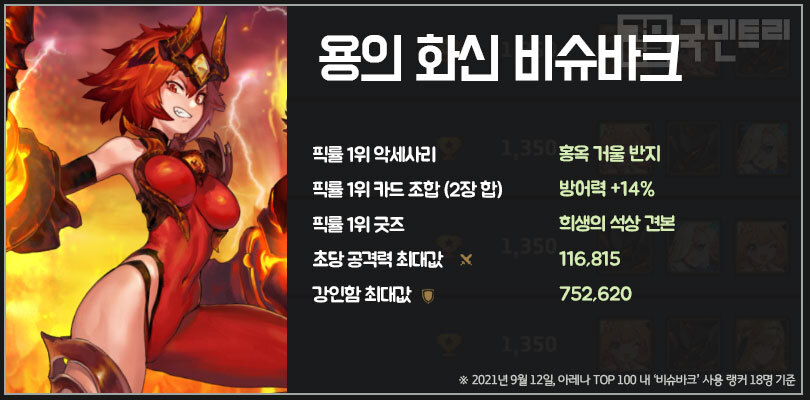 그중에서도 몇 차례 패치가 이뤄진 ‘용의 화신 비슈바크(이하 비슈바크)’가 아레나에서 부상했다. 직전 시즌에는 픽률 18%로 6위에 이름을 올렸는데, 과거 전성기 시절의 수치를 거의 회복한 모습이다. 이런 ‘비슈바크’를 최근 아레나 천상계 랭커들은 어떻게 세팅했는지, 국민트리가 관련 정보를 조사했다.