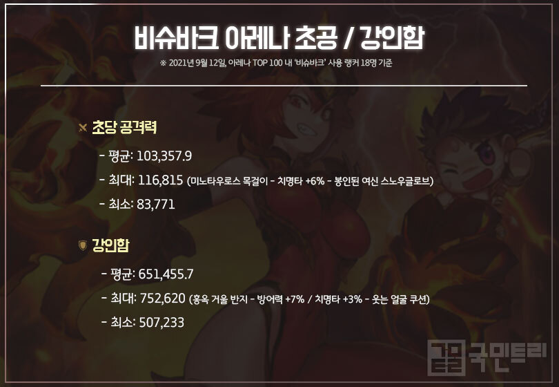 마지막으로 조사 당시 ‘비슈바크’의 아레나 TOP 100 스펙을 알아보자. 초당 공격력은 평균 10만 3,357.9, 최대와 최소는 11만 6,815 – 8만 3,771이었다. 최대 수치 랭커는 ‘미노타우로스 목걸이 – 치명타 +6% – 봉인된 여신 스노우글로브’로 ‘비슈바크’를 세팅했다.