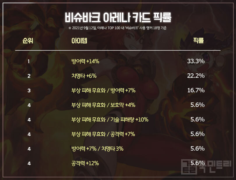 ※ 아레나 데이터가 기반이라, PvE 세팅과는 다를 수 있습니다.
