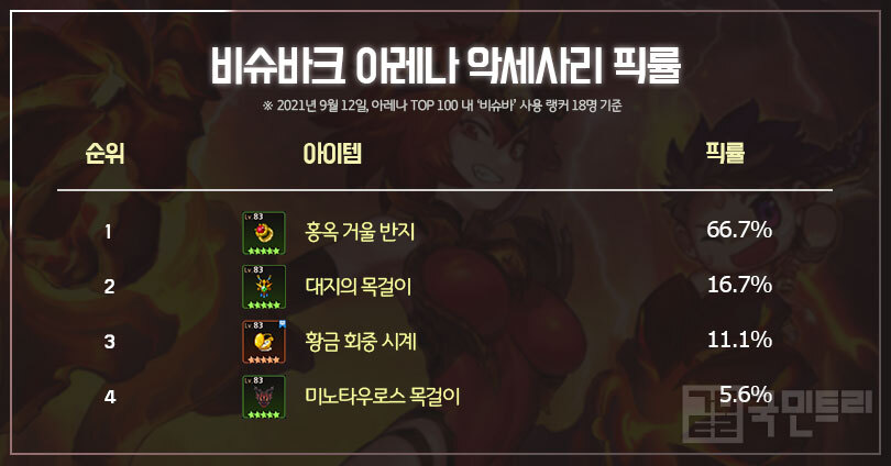 ‘비슈바크’의 지난 시즌 1위 악세사리는 ‘홍옥 거울 반지’의 것이었다. 픽률은 66.7%로 과반수를 기록해 사실상 ‘비슈바크’의 교복 장비로 볼 수 있다. 그리고 2위에는 ‘대지의 목걸이’가 이름을 올렸다. 아레나 1티어 악세사리라 할 수 있지만, ‘홍옥 거울 반지’와 비교하면 선택 횟수가 굉장히 낮아 다른 영웅들과 차이를 드러냈다.