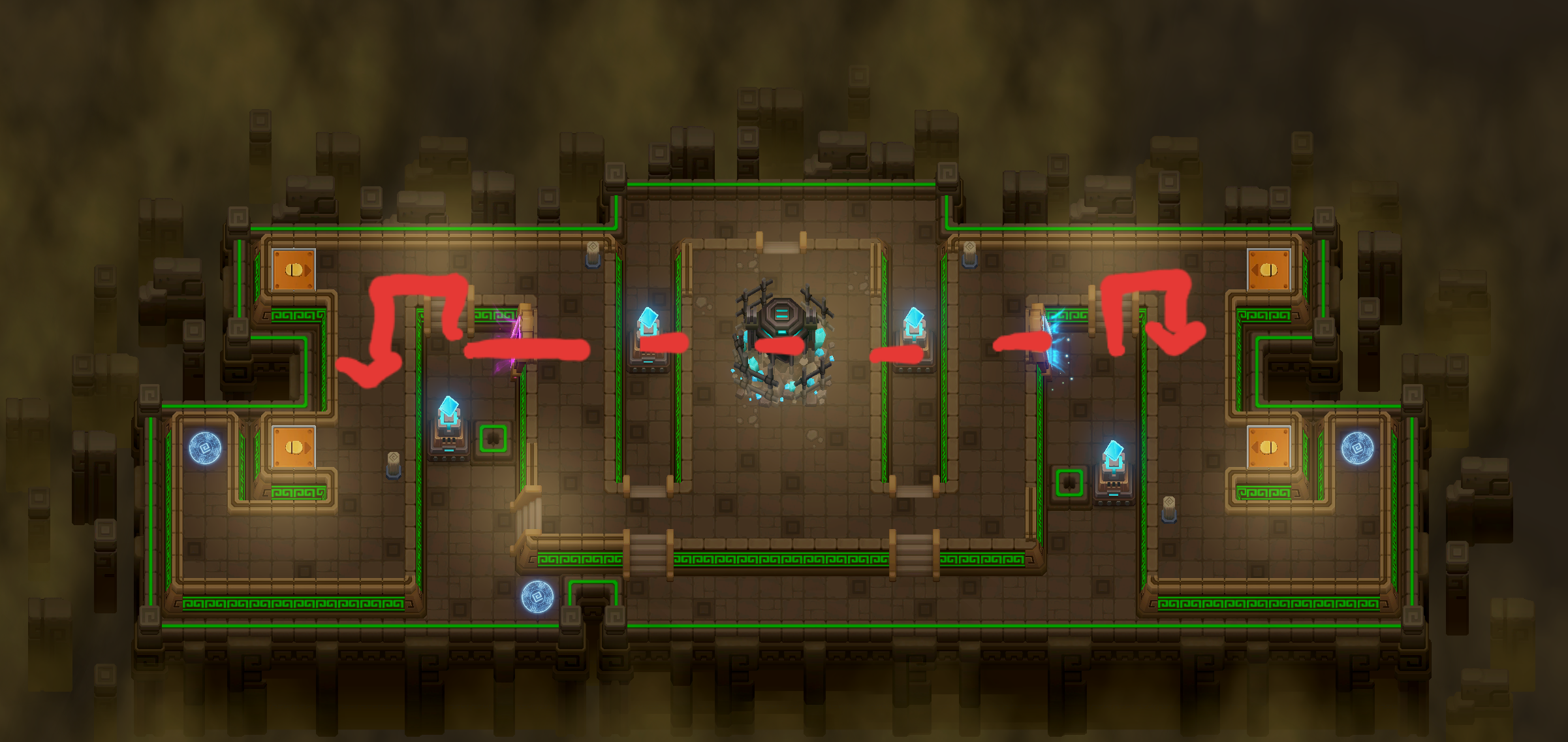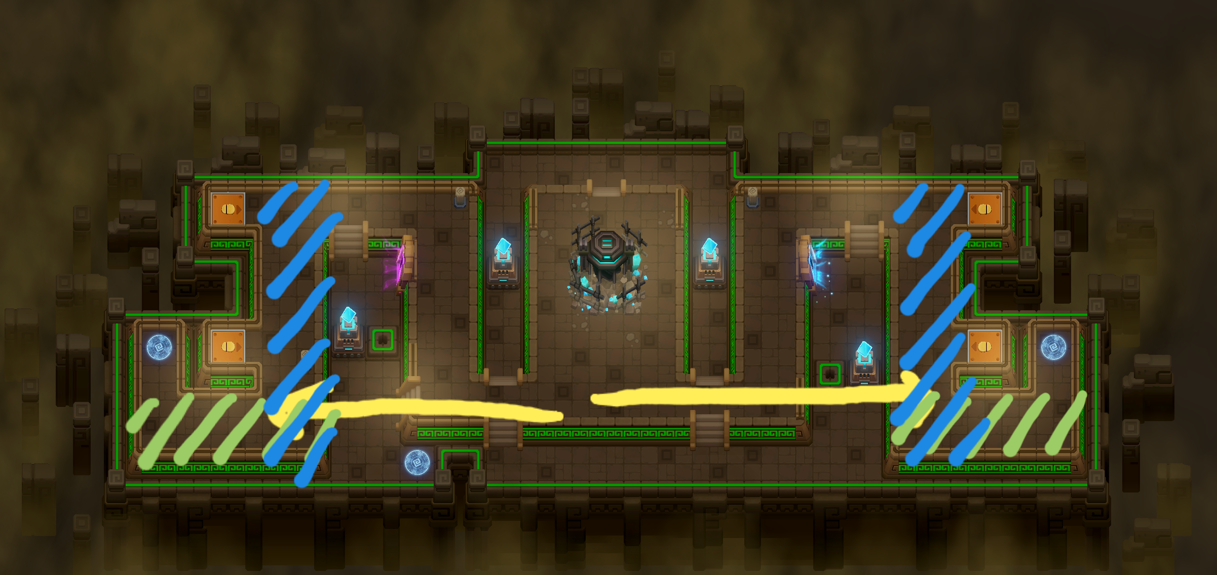 노란화살표 이동방식이 리젠장소에 조금 더 빨리 가깝게 가긴하나 초록색빗금 통로가 파란색빗금 통로에비해 직선스킬 쓰기엔 통로도 짧고 몹이속이 빨라서 이미 지나가 놓치기 쉽기 때문