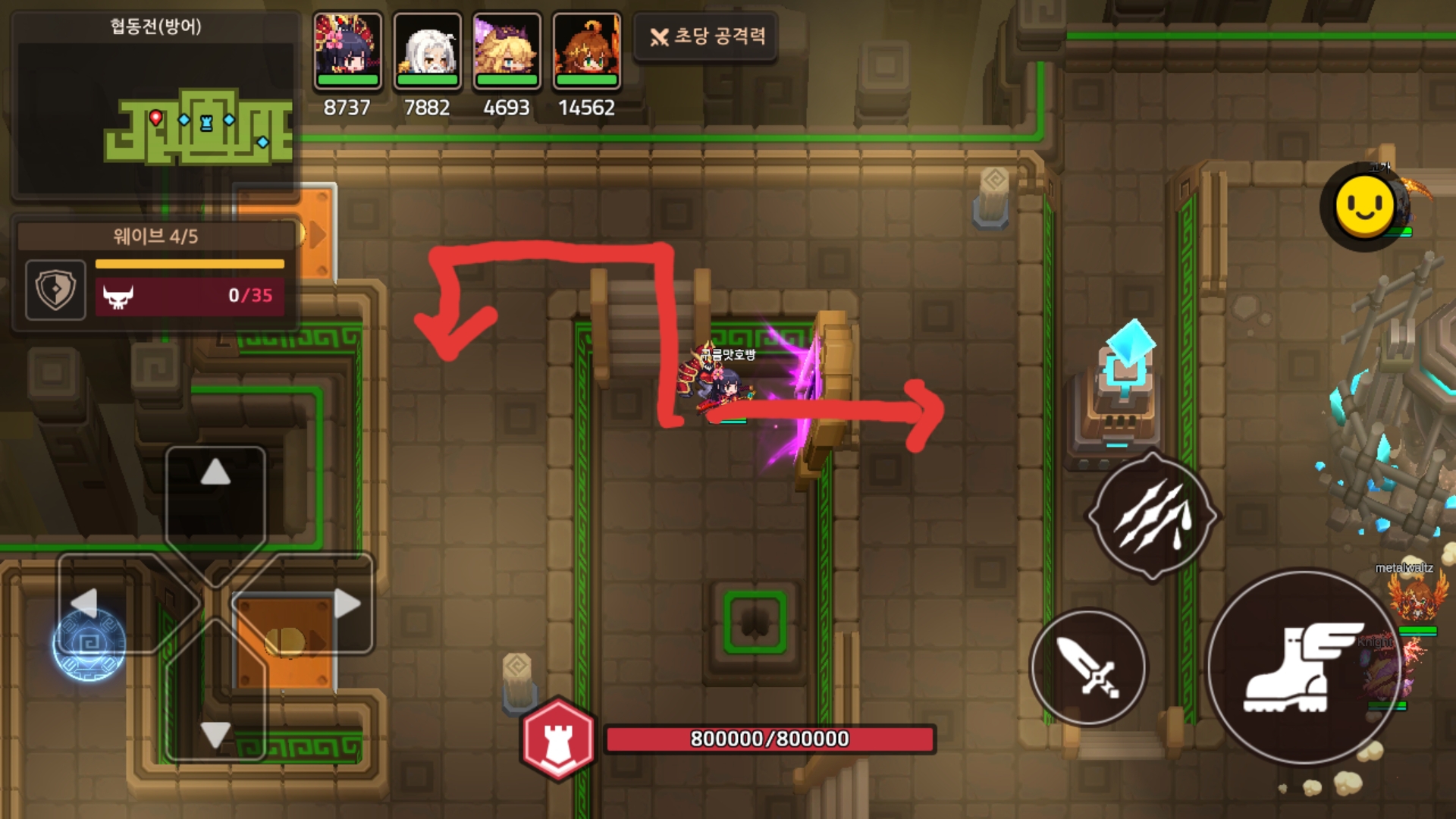 몹이 다행히 우측통로에서 왔어도 6번에 비해 후방인데 지나치게 뒤로 도착했기에 또 걸어가야함