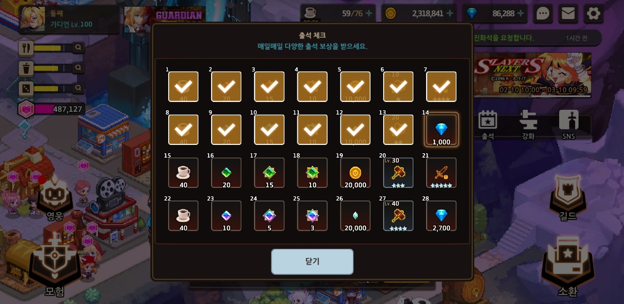 일일보상 : 아레나 50젬, 길드 출첵 20젬 (총 1,960젬)