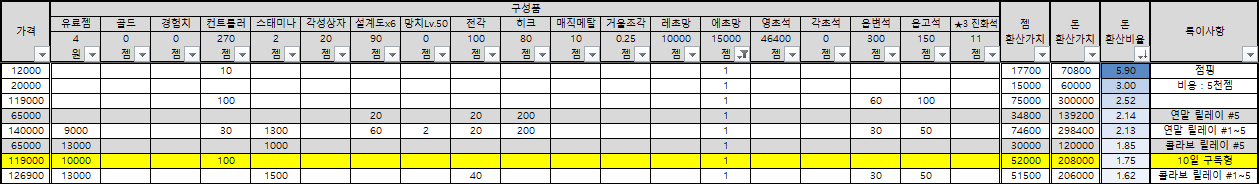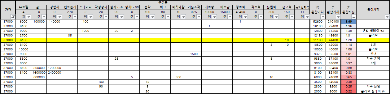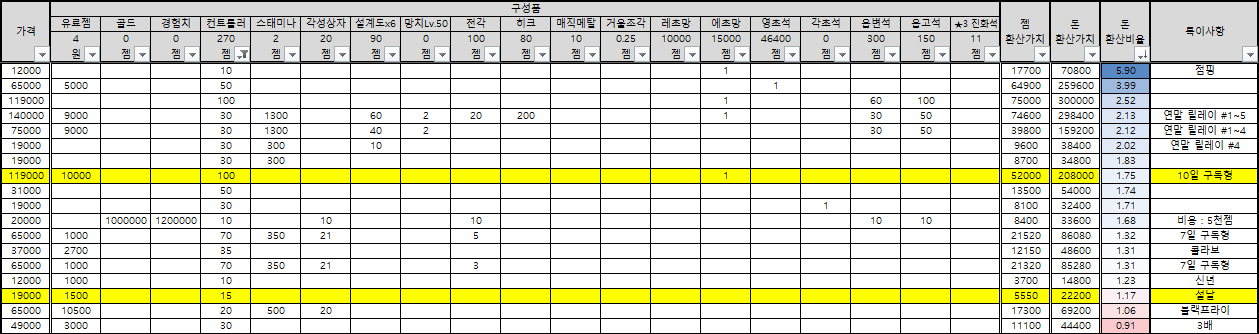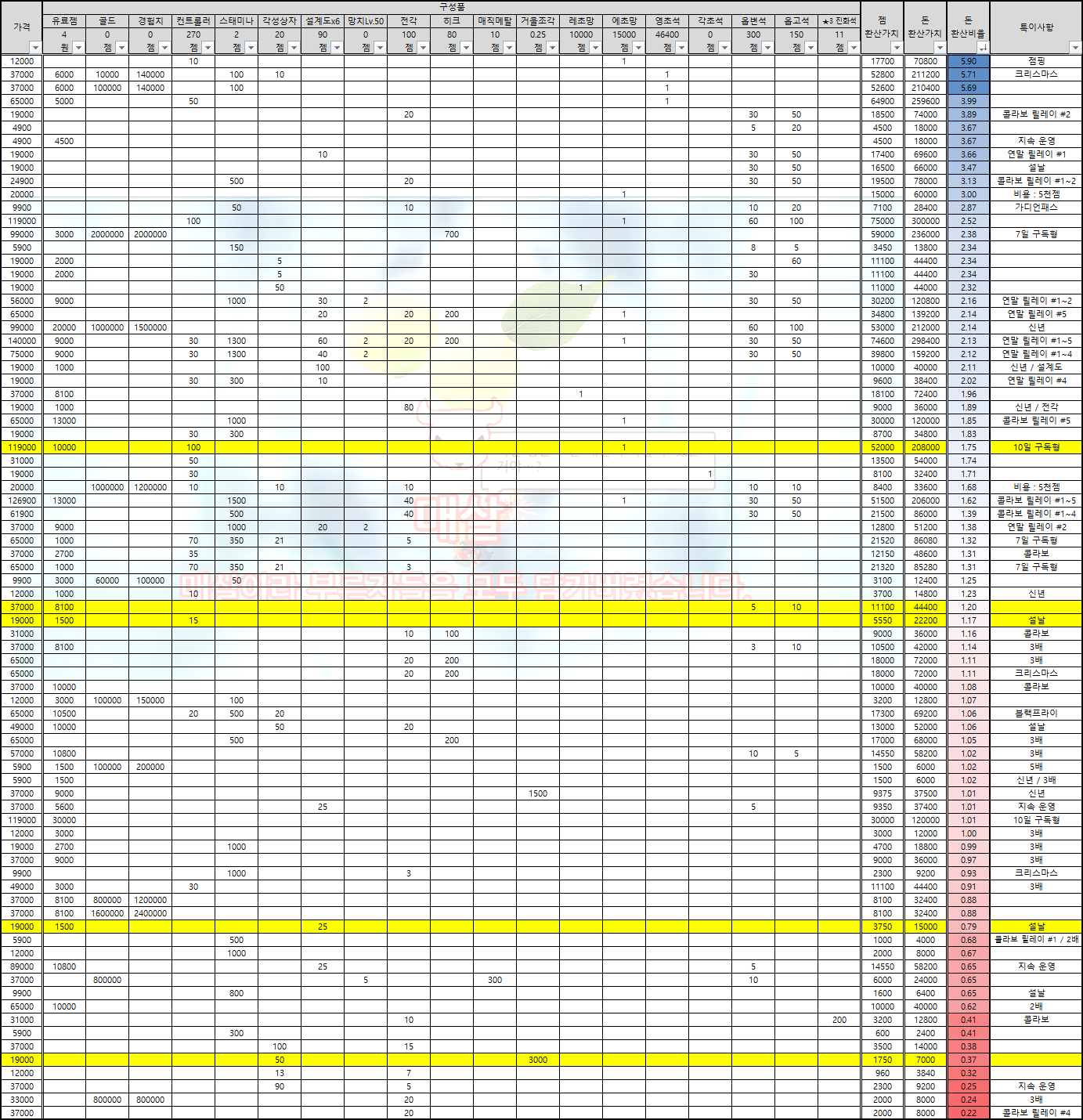 효율적인지 비효율적인지는 '돈 환산비율'로 한눈에 보기 쉽게 그라데이션으로 정리해봤어용..!!