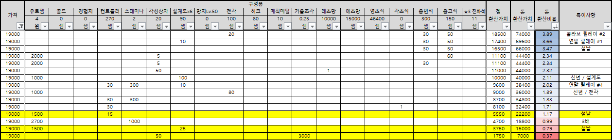 노란색셀은 이번에 새로 출시한 패키지들이고,