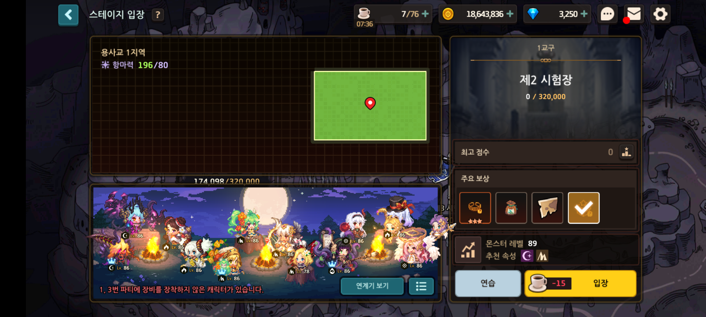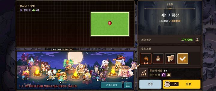 이 파티들 중에 한 파티 짜서 스테이지를 플레이 해보면 된다. 사진에 나온건 3팟 12캐릭이지만 실상 첫스테이지는 파티 하나만 써도 무방하다.