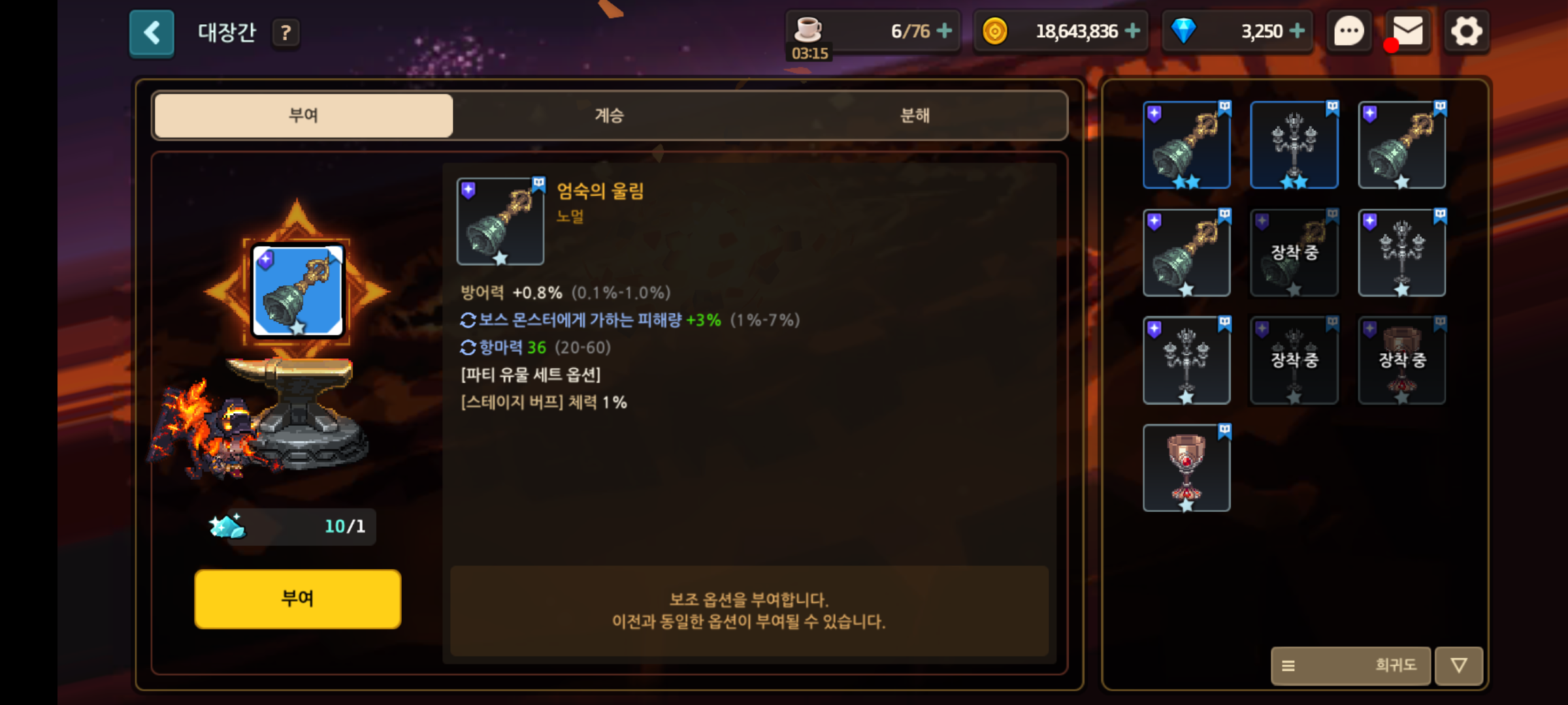 이제 유물 획득량 증가 옵션을 가진 유물을 끼고 반복해주면서, 더 다음 단계의 스테이지를 열고 유물을 파밍하면 된다.