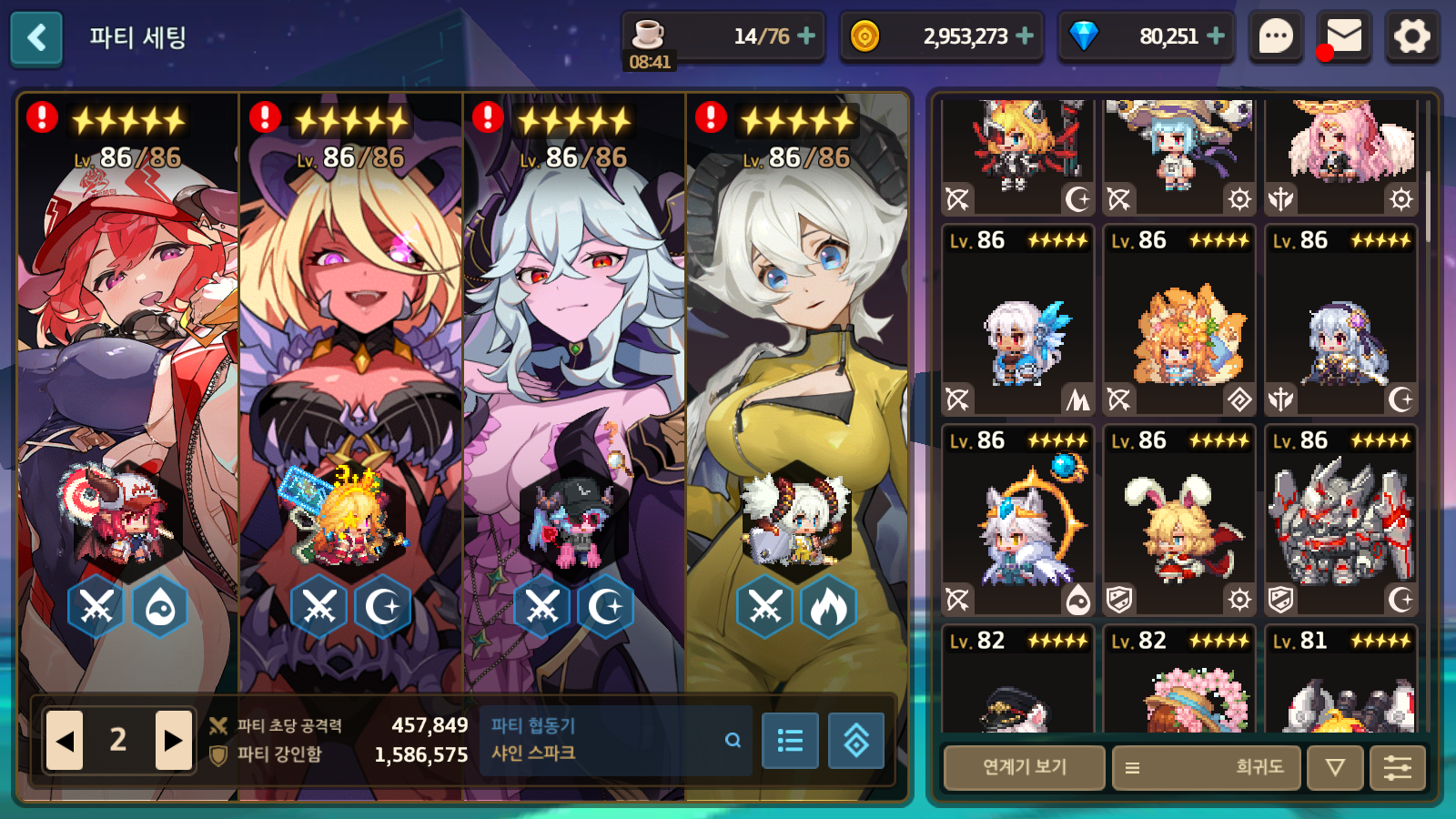 속공증+원피증+기피증(총그마)으로 클로드 무스딜을 최대한 끌어올린 덱입니다. 여기에 무스쿨 땡길거면 미기(제로스), 대보스 방깎러 필요하면 카마엘, 파벞 시너지 최대로 뽑고 싶으면 맠투를 넣으면 됩니다. 최근 패치에 미기가 무기 스킬 사용시 파티원들에게 기피증을 늘려주는 버프를 받으면서 제로스보다 미기가 훨씬 더 좋아졌습니다.