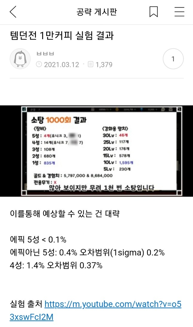 템던 확률표 및 메탈 획득을 위한 커피소모의 결과