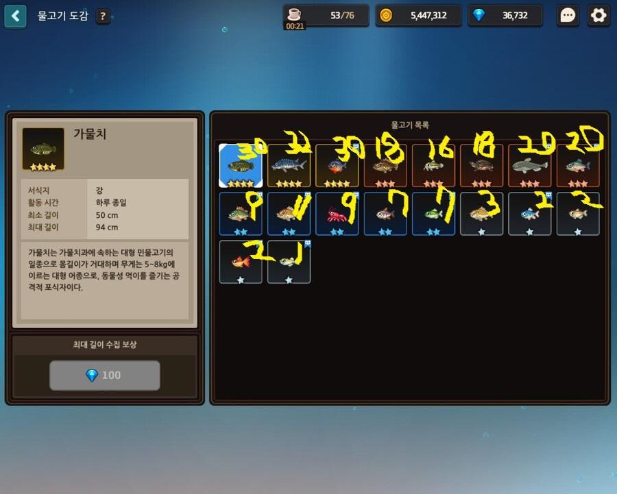 4성: 가물치 30, 철갑상어32, 피라냐30