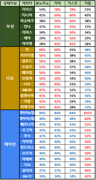 상태이상표입니다. 1퍼 정도 오차 있을 수도 있어요.