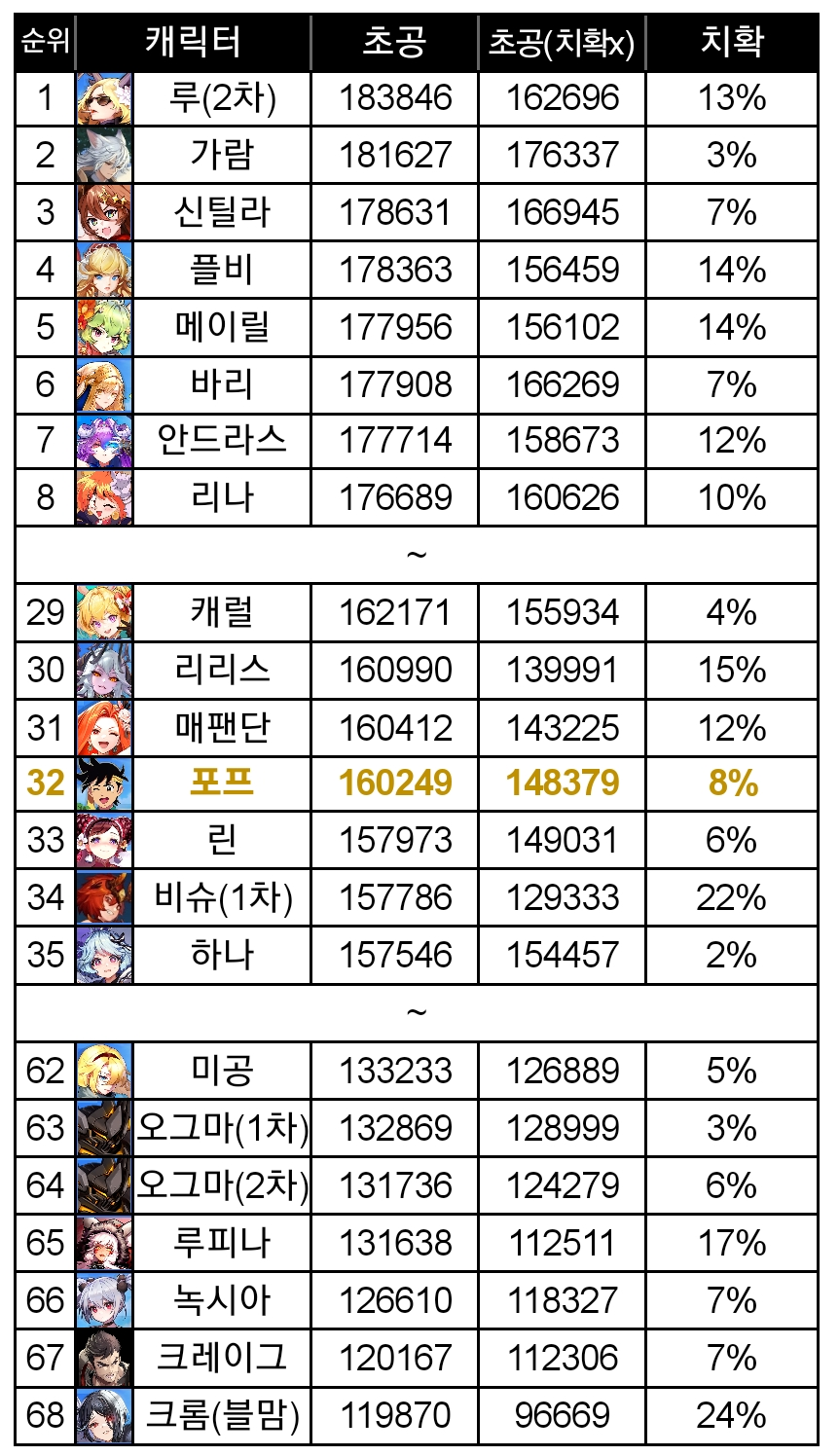 참고로 대부분의 캐릭터가 200%가 넘는다는건, 그 200% 정도는 넘어야 길레에서 2연계 무스 뜬다는거임. 안뜨면 무스 데미지가 높거나 쿨이 짧은 대신 3연계를 취하는 느낌인데, 포프는 그마저도 아님.