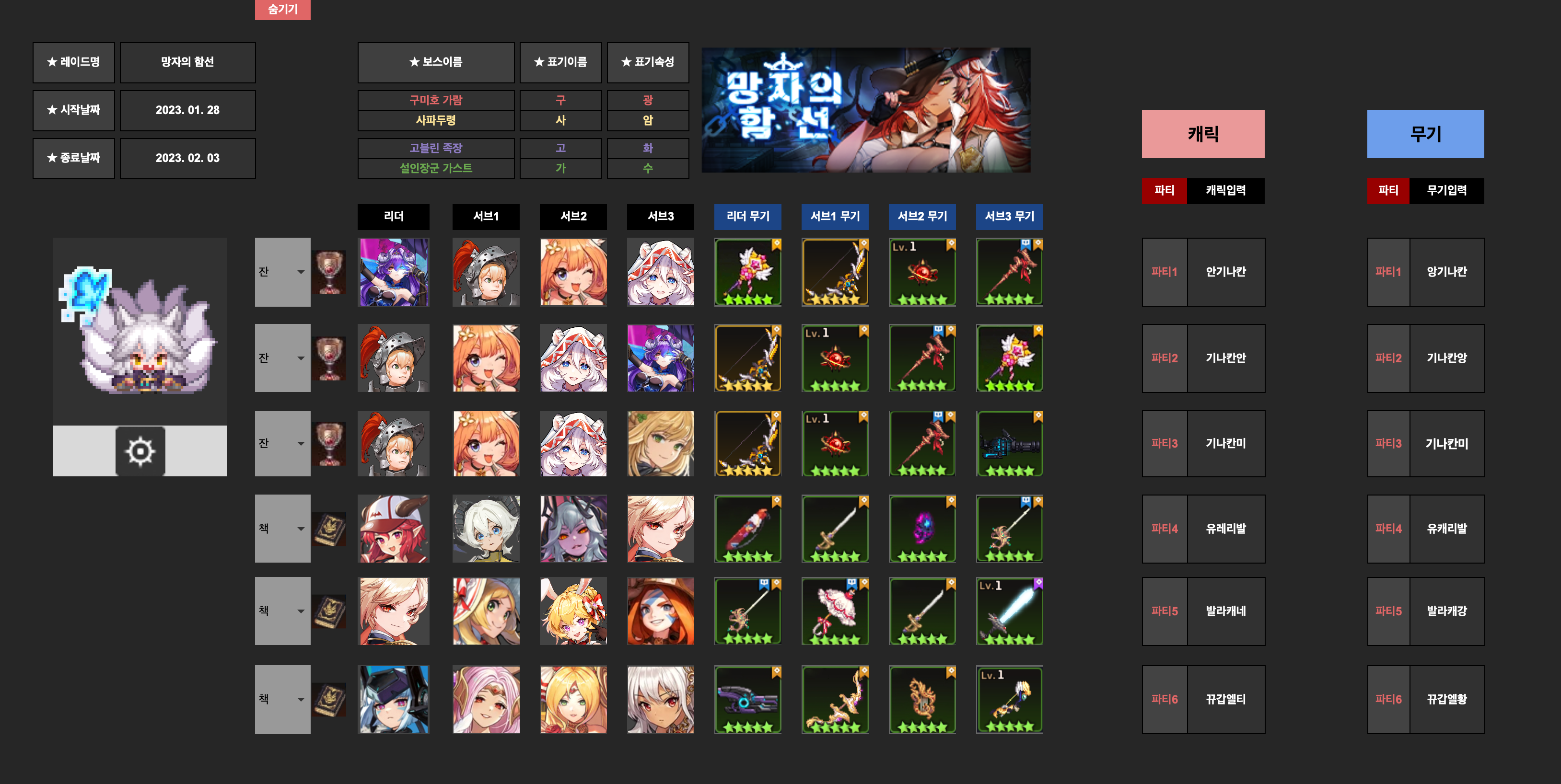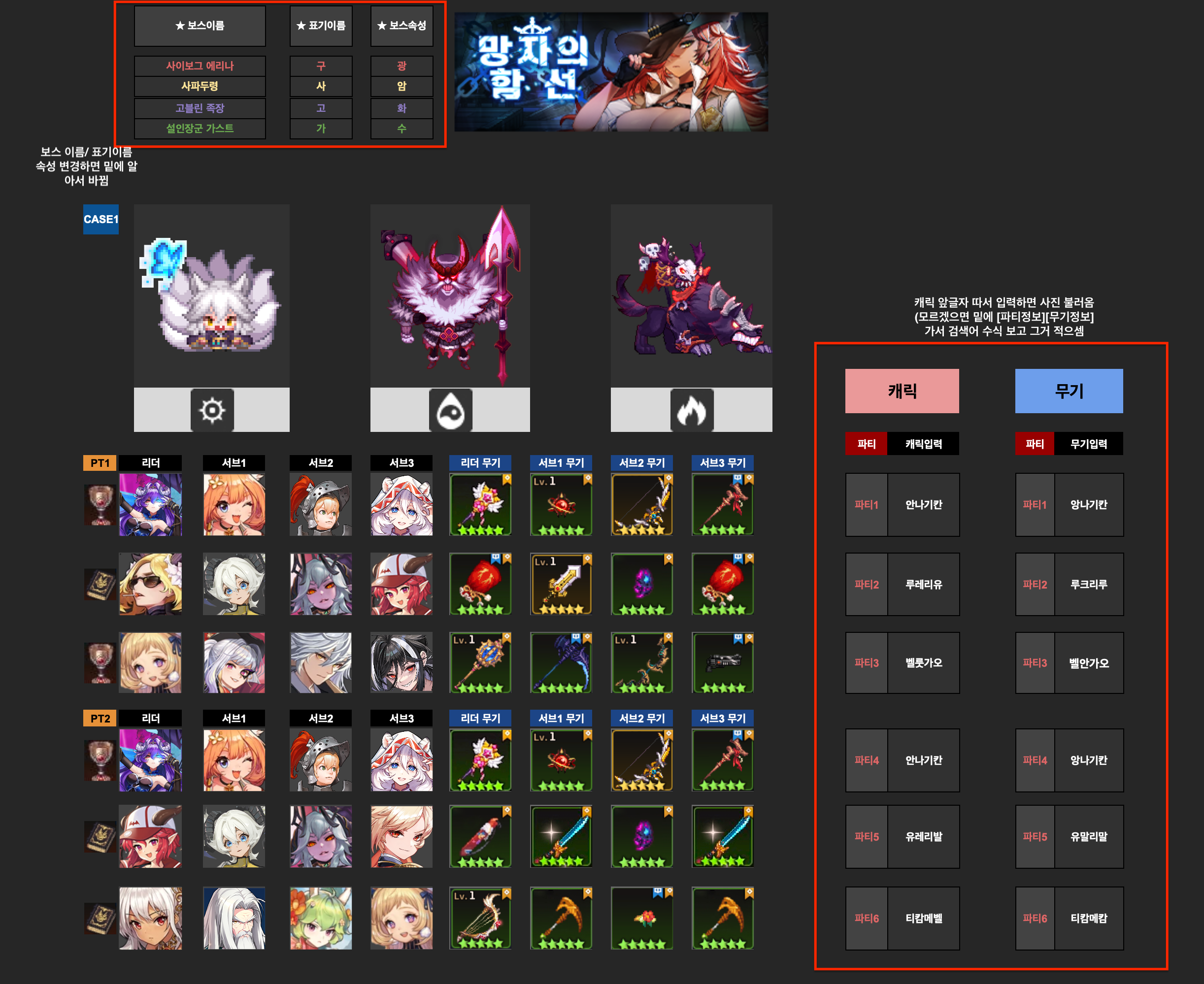 (바꾸고싶으신 분들은 밑에 시트 [파티 정보][무기 정보] 가서 검색어 칸 바꿔주시면 됩니다.)