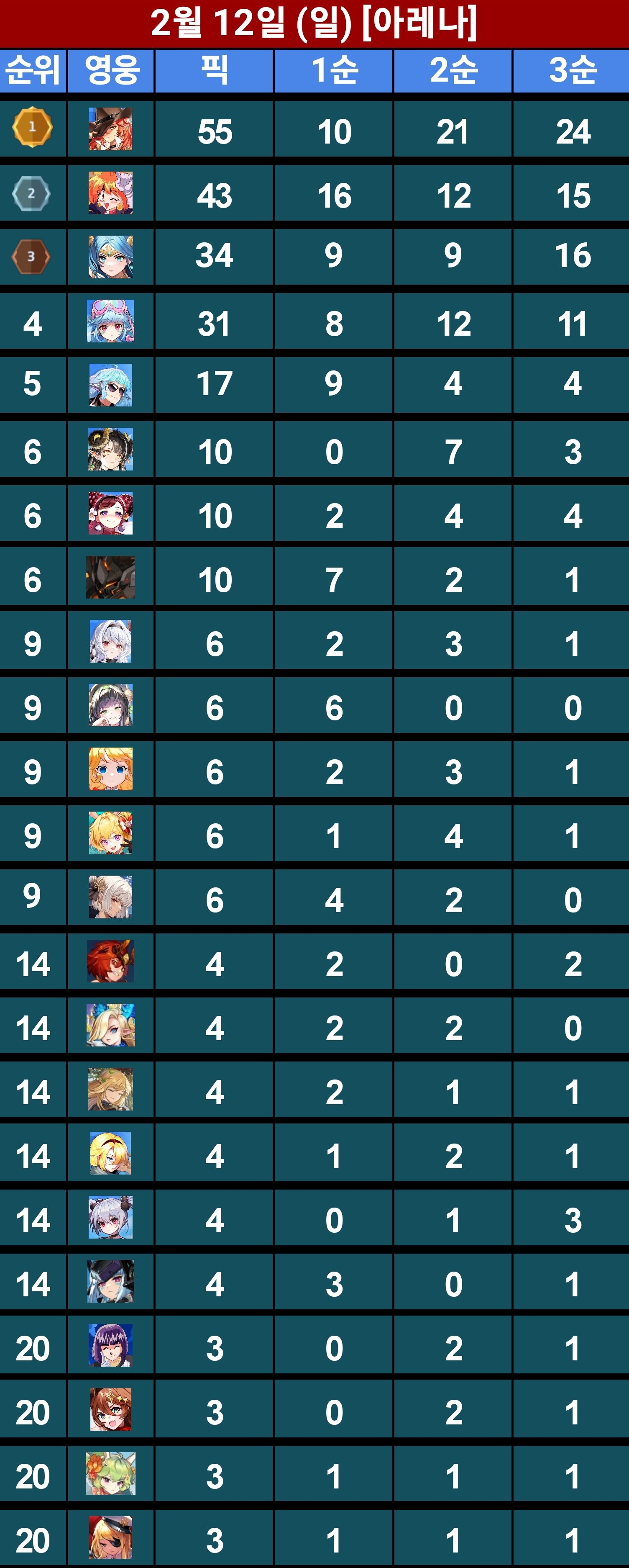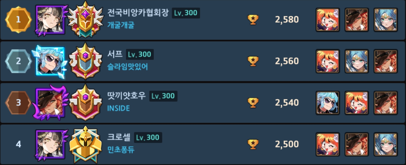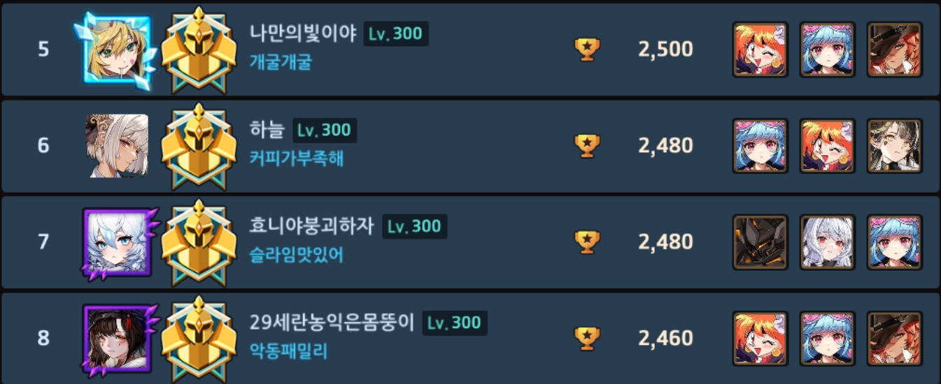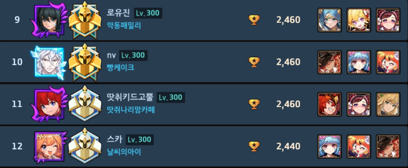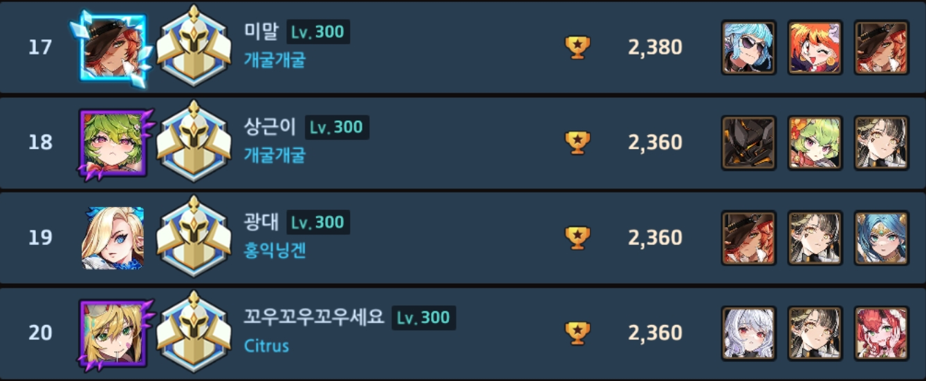ㄴ(프리실라) 얘가 사실 아칠이만 잘잡았어도...라고 가정하기엔 에리나도 날뛰어서 좀 어려운듯 극딜엔 극방으로 대처하는 방법이 있을지도 모르겠으나 일단 파벞 밸류는 둘째치더라도 극딜덱쪽 멤버가 프실한테 있어서 악재라 어려움, (클라라) 이번맵은 리나 하위호환이지만 딴맵 가면 얘도 지랄임, (캐럴) 얘도 나름 근딜치곤 선공권 들고 있는 편이라 좀 나오긴 했지만 그래도 근딜은 근딜이긴 함, (비앙카) 평타 찍누엔 일가견이 있으나 인식 자체가 비주류기도 하고 이번 맵이 넓기도 넓어서 맠투 아칠이한테 밀렸음, (맠뀨) 승률이 그렇게 높은건 아닌데 얘도 극딜 평타쌈 원조라 평소보다 아주 조금은 더 나옴.