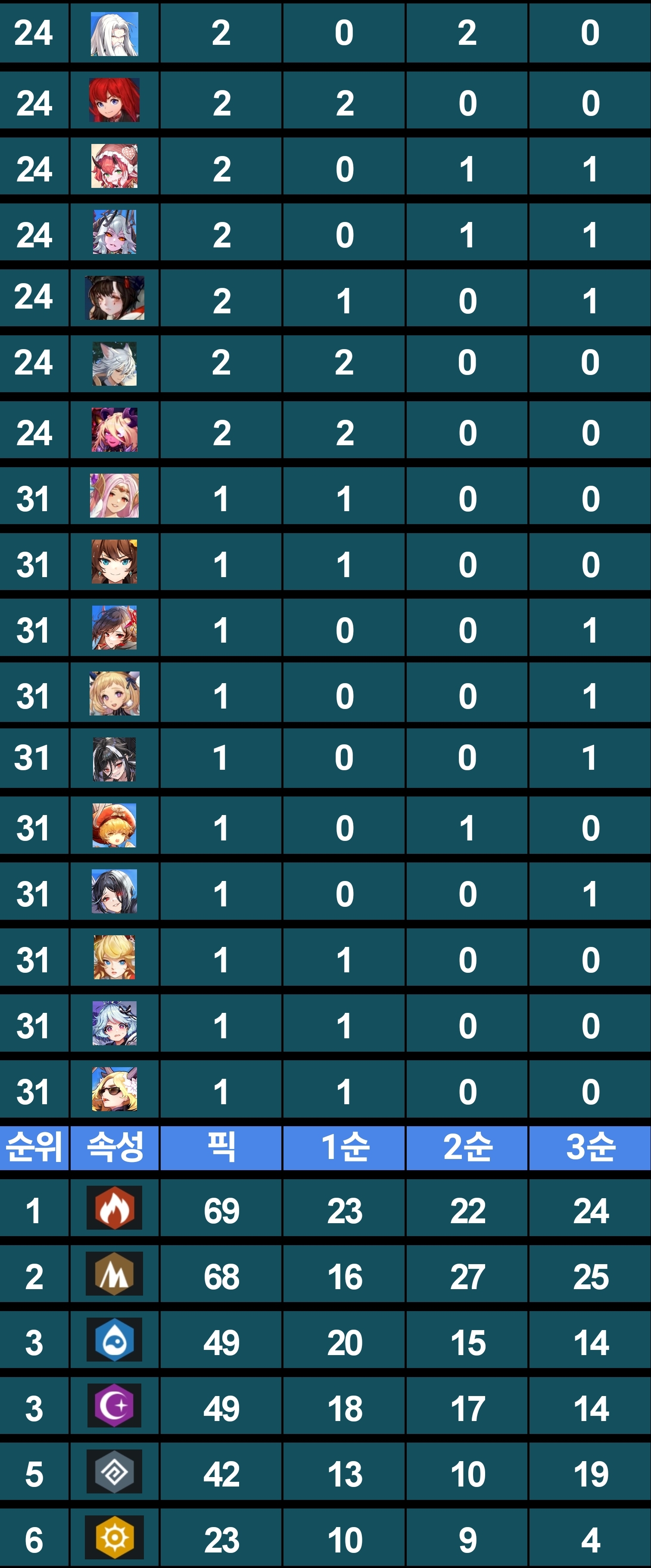 ㄴ사실 떨어지는 캐릭들 있는만큼 올라오는 캐릭들이 많으면 상관 없거든? 근데 단순하게 딜로 찍어누르는건 정말 원시적인 방법이기에 이쪽 분야의 캐릭터들은 뭐랄까 양극화가 심함. 따라서 현 픽률 상위캐릭터들이 전부 픽률 독식하며, 굳이 그런게 아니더라도 로제타가 덱에 무조건 껴 있어야 하다보니 픽률 중하위권 캐릭터들의 픽률이 거진 빨려서 대부분 뒤짐.