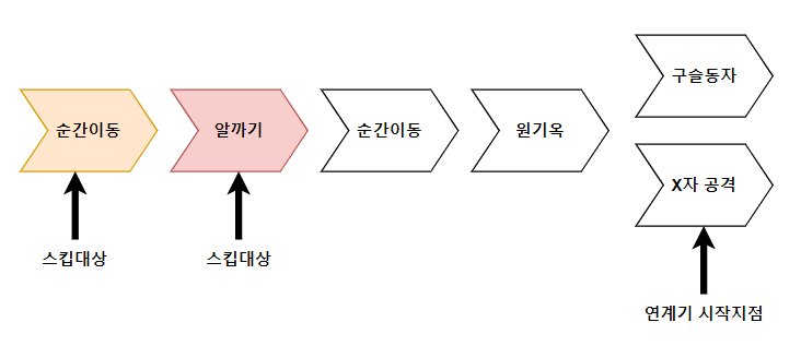 암흑마법사의 기술순서는 아래와 같고, 필살기인 구슬동자와 X자공격은 번갈아가면서 발동합니다.
