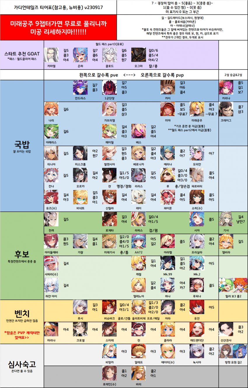 2023년 9월 18일자 가테 티어표 갱신 작성자한화우승못해도가테접을듯|작성시간23.06.17|조회수40,615 목록 댓글 8 글자크기 작게가 글자크기 크게가 6월 17일자 갱신 된 티어표9월 18일자 갱신 된 티어표https://m.dcinside.com/board/guardiantales/4882980티어표 갱신 끝(v.230918) 밑에 글 무조건 읽기!!!!!!! - 가디언 테일즈 마이너 갤러리여기 갤러리 사람들은 썩고 썩어 문드러진 고인물밖에 없어서 질문 다 받아줘서 좋더라!!!!!!!!!!!!이 티어표는 참고용이니까 꼭!!!!!!! 꼭!!!!!!!!! 보고 궁금해 하지만 하지 말고 갤에다 물어보라고!!gall.dcinside.com작성한 갤럼에게 따뜻한 감사의 한마디 부탁드립니다. 다음검색 현재 게시글 추가 기능 열기 북마크 공유하기 신고 센터로 신고 댓글 댓글 8 댓글쓰기 답글쓰기 댓글 리스트 작성자크레센트 | 작성시간 23.06.18 감사의 한마디를 전해주세요 작성자타이밍 | 작성시간 23.06.18 전해주셔서 감사합니다 ! 작성자꼬마혀니 | 작성시간 23.06.19 TOP이 좋은거예요? 아니면 스타트 추천이 좋은거예요? 답댓글 작성자공지확인용계정2 작성자 본인 여부 작성자 | 작성시간 23.06.19 처음 시작하는 기준이라면 스타트 추천이 더 좋다고 봅니다 답댓글 작성자dkrnajd | 작성시간 23.06.29 스타트추천은 거의 필수느낌에 가까워요 댓글 전체보기