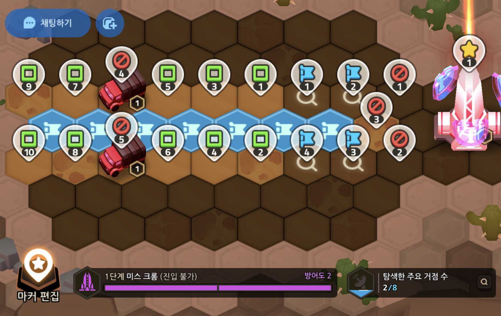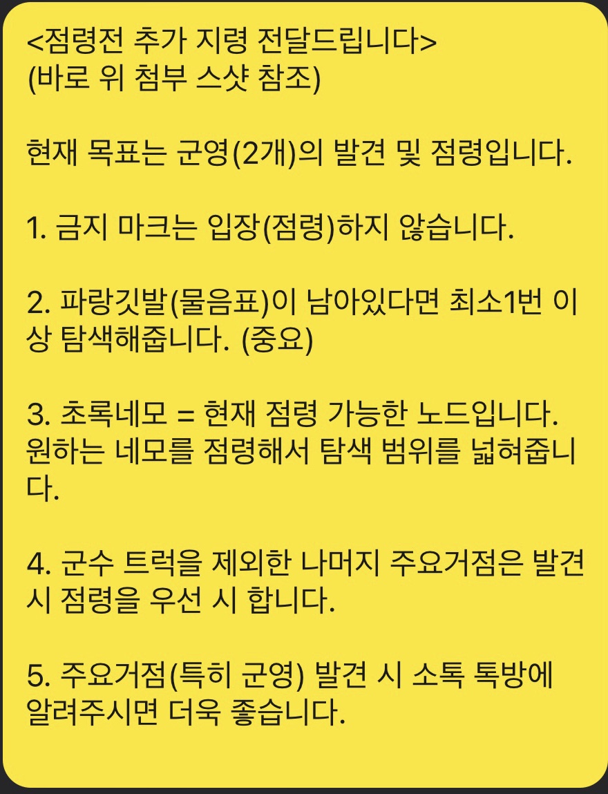 탐색을 통해 점령 가능한 곳이 발견되고, 점령을 통해 추가로 탐색할 수 있는 범위가 생성되는 구조이기 때문에 탐색 운도 무시 못 합니다. 하지만 그렇기 때문에 더욱 목표가 중요합니다.