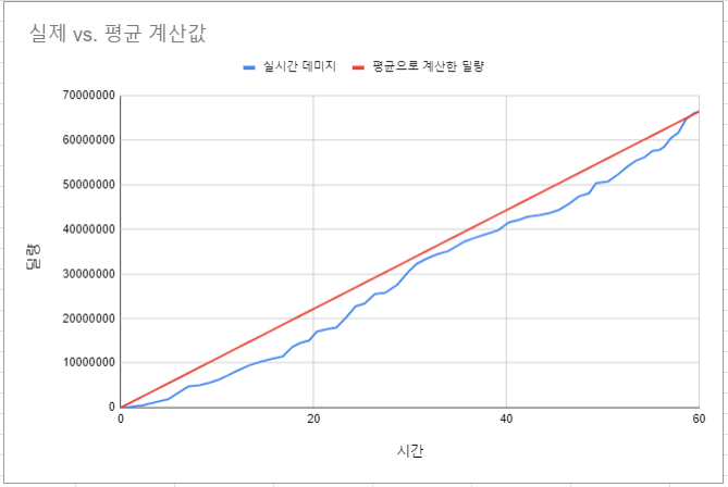 실제 들어간 딜량을 보면 기울기가 오락가락하는 게 보인다. = 초공이 항상 같지 않다는 것.