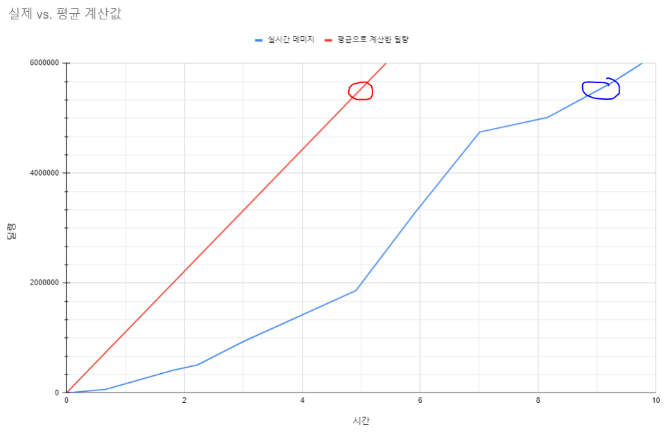 예를 들었던 550만까지 도달하는 시간이 실제 딜량의 경우 대략 9초 걸리는 것을 볼 수 있다 (파란 표시).