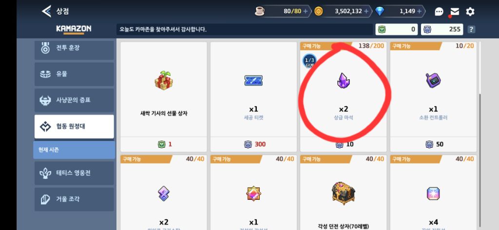 진화석or재화던전 부스터 10회 (나머지는 테티스)