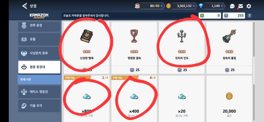 -협정대 주화로 책 3성 4개, 촛대 3성 4개, 마석 100개, 빛나는 가루 사기