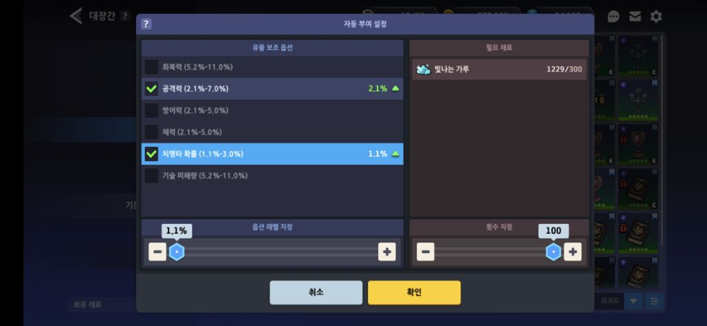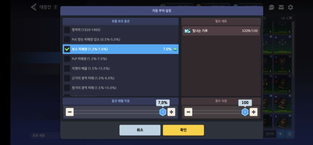 자동부여시 수치, 횟수 모두 최대치로 맞추고 돌리기