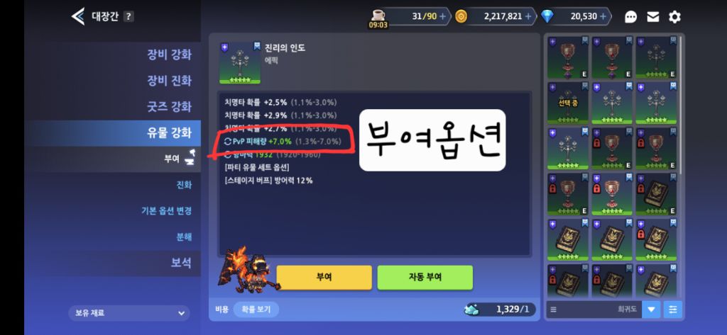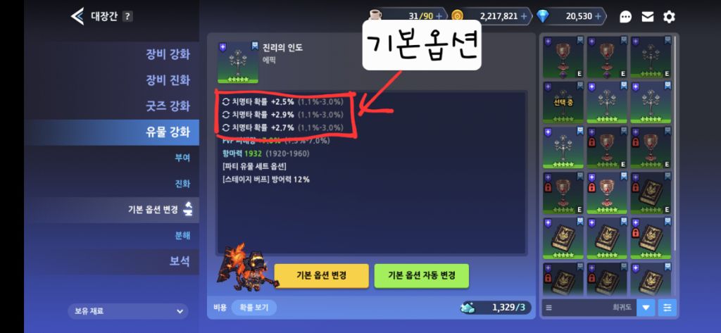 - 대장간 - 유물 - 기본옵션변경 탭에서