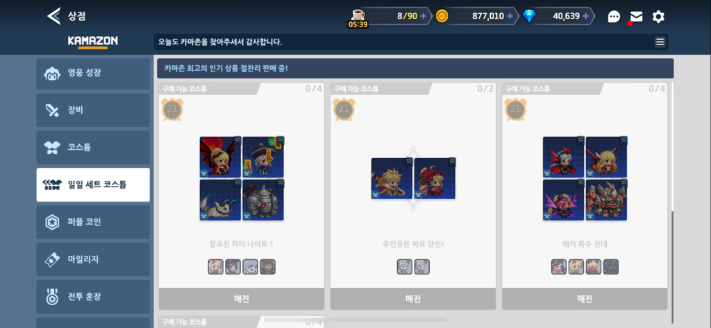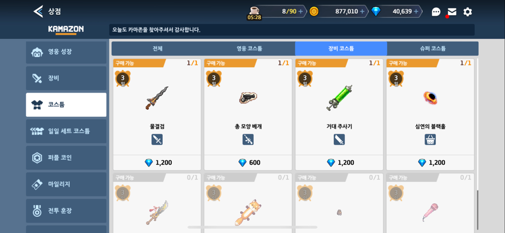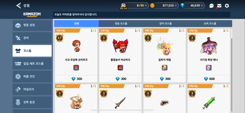 일일세트코스튬, 장비 코스튬이 보이실 겁니다.
