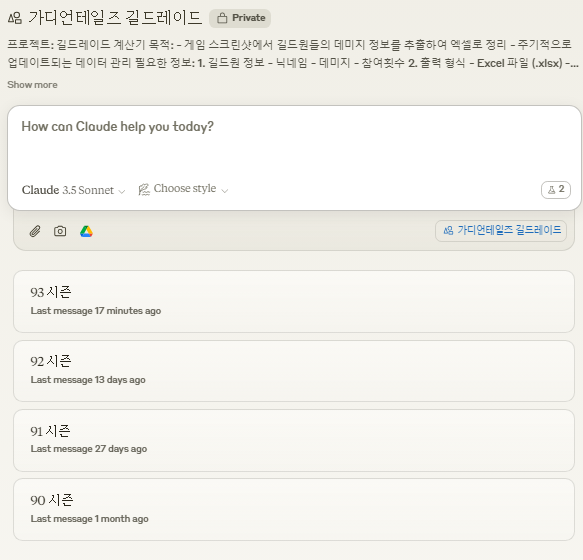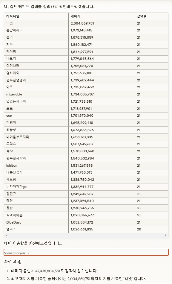 매 시즌 종료 후 모든 길드원의 출석과 최종 딜량을 엑셀에 기록하다가 유행처럼 생겨난 생성형 AI에 도움을 받을 수 있을까 해골을 굴렸고, 어느 정도 만족스러운 결과를 얻게 되었습니다.