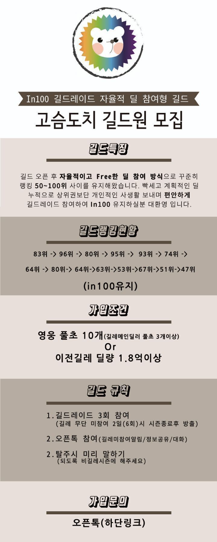 ♡고슴도치♡ 20위! 요양길드! 휴식길드! 길레 막치는 즐겜 길드! 1분 모셔요♡ 작성자하늘이옹|작성시간22.06.07|조회수42 목록 댓글 1 글자크기 작게가 글자크기 크게가 최장수 길드 고슴도치에서 1분 모셔요 여성유저도 많고 다들 즐겜하면서 길레 막치며 재미로 하는 즐겜 길드 입니다.길드가입 문의 댓글 클릭 부탁드려요 ~ ♡ 다음검색 현재 게시글 추가 기능 열기 북마크 공유하기 신고 센터로 신고 댓글 댓글 1 댓글쓰기 답글쓰기 댓글 리스트 작성자하늘이옹 작성자 본인 여부 작성자 | 작성시간 22.06.07 https://open.kakao.com/o/sVEmkuXc 댓글 전체보기